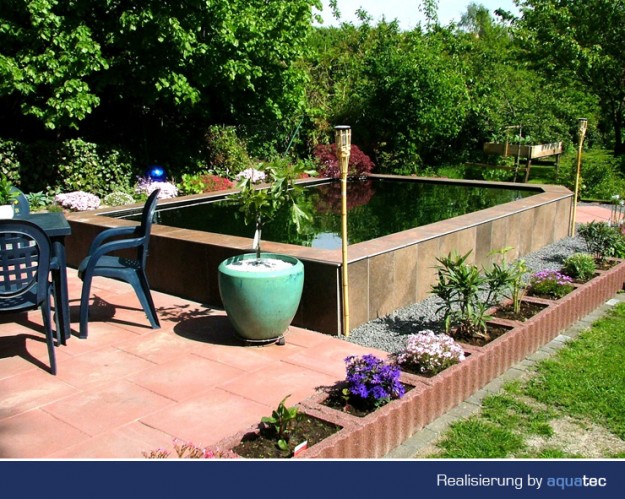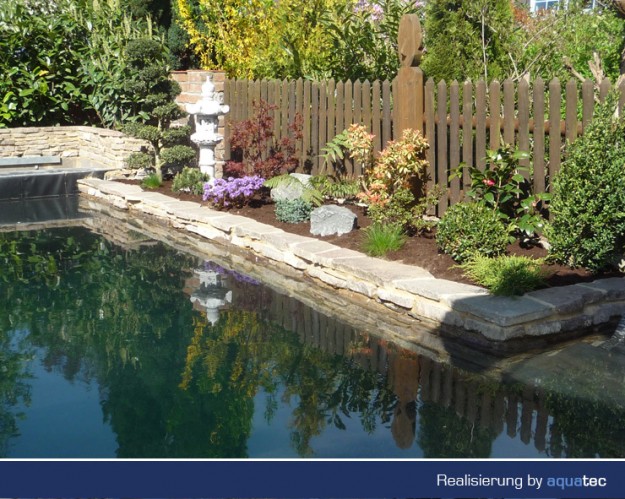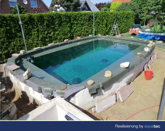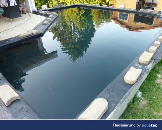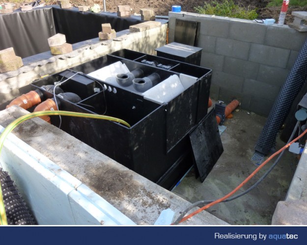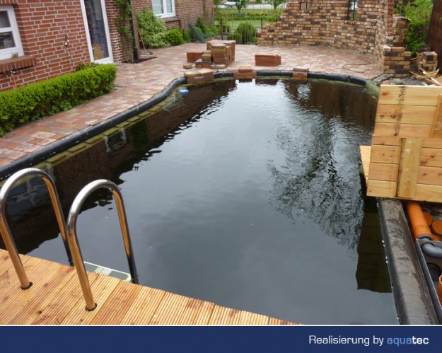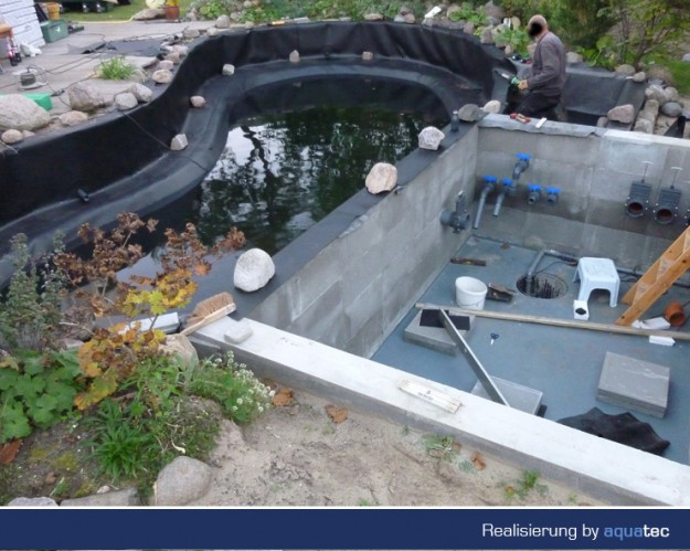 Projekt Koiteich 42m³ -Bielefeld, mit Filtersystem Inazuma Trommelfilter ITF-80 BioKompakt MK III, Filter -Förderpumpe FlowFriend, Folienverlegung OLIV faltenfrei, Montage & Installation des Filtersystems… individuelle Lösung: hier Montage in einem „Gartenhaus“. Planung & Bau-Realisierung by a q u a t e c
