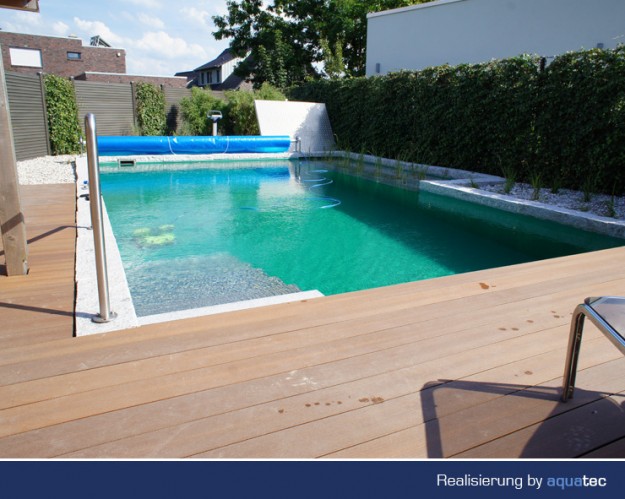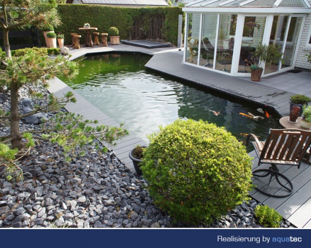 Projekt Koiteich 75m³ , mit Filtersystem -Smartpond EBF 1200S FullPackage & Schallschutzdeckel –2X FlowFriend, Zusatzbiokammer, Folienverlegung faltenfrei, … individuelle Lösung: hier Montage „Garage“. Planung & Bau-Realisierung by a q u a t e c